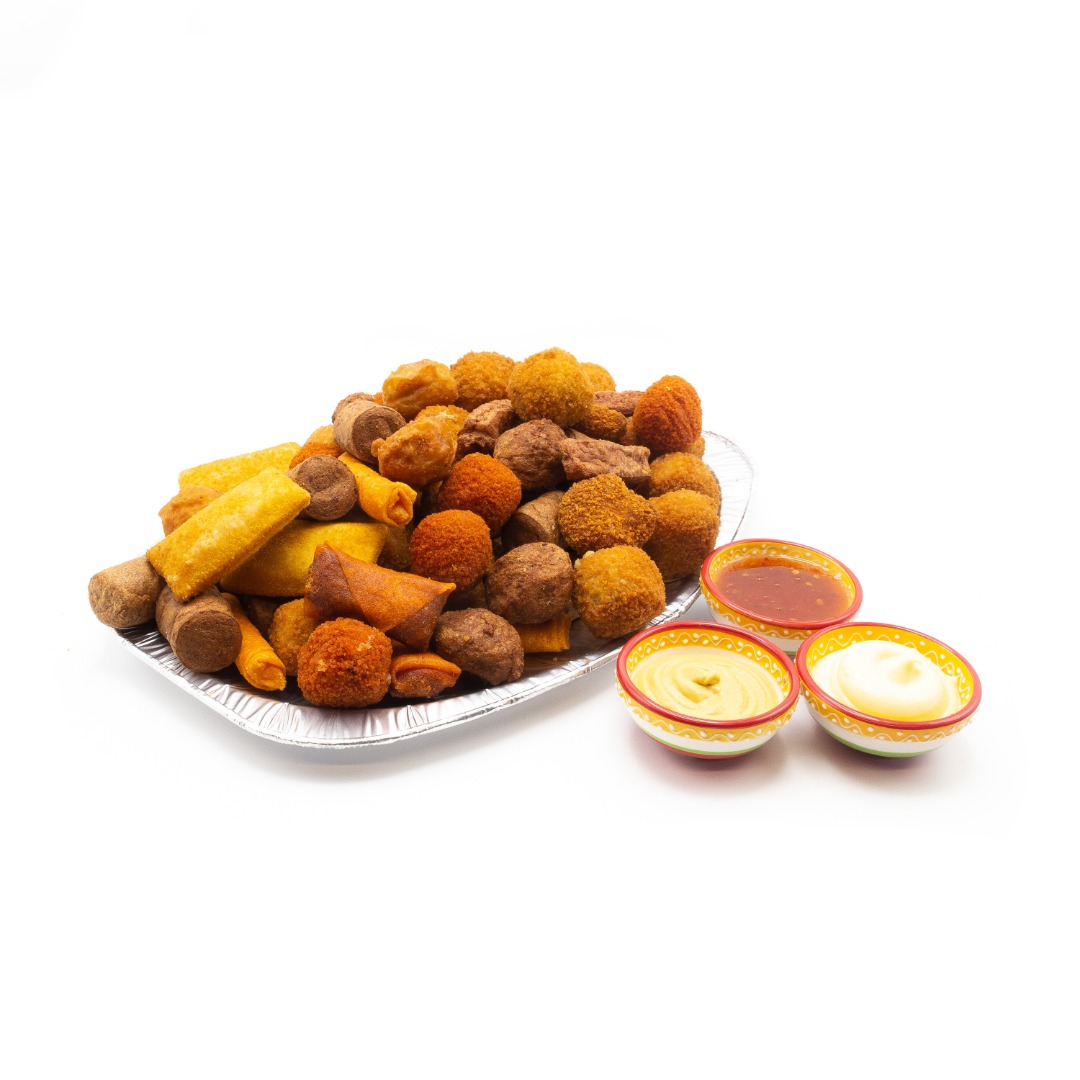 Een beste schaal vol! We leveren de chilisaus, mayonaise en mosterd erbij!